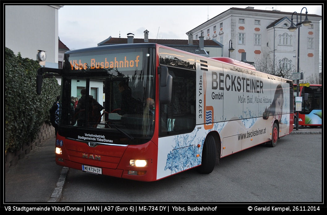Die beiden MAN Niederflurbusse, übrigens die ersten in Ybbs, tragen auf beiden Seiten Vollwerbung.