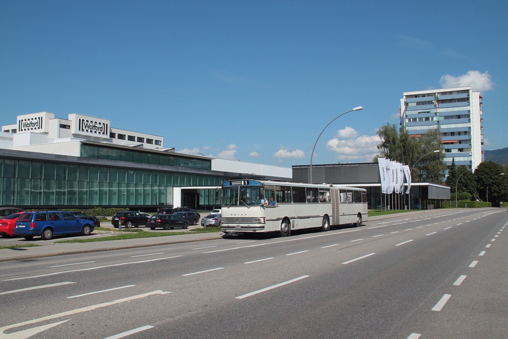kurzen Fotohalt vor der bereits modernen Strumpfhosen-und Dessousfabrik Wolford machte.
