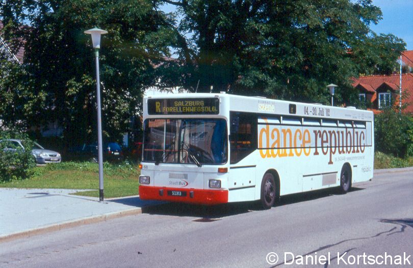 Auf den Bildern zu sehen: Ein Bus der Linie R in Freilassing und bei der Forellenwegsiedlung sowie zwei Obusse der Linie 29, ebenfalls bei der Forellenwegsiedlung.