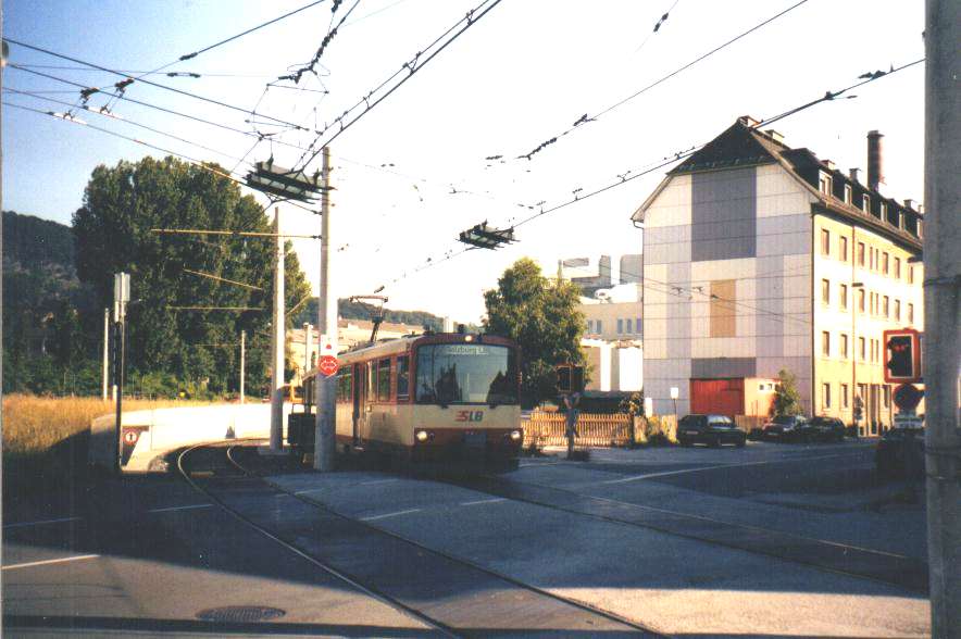 21_23: Ein Lokalbahntriebwagen der gerade vom Hauptbahnhof kommend auftaucht