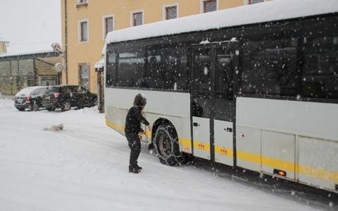 An einem wurden gerade Schneeketten (mit Hilfe einer Zivilperson) angebracht,