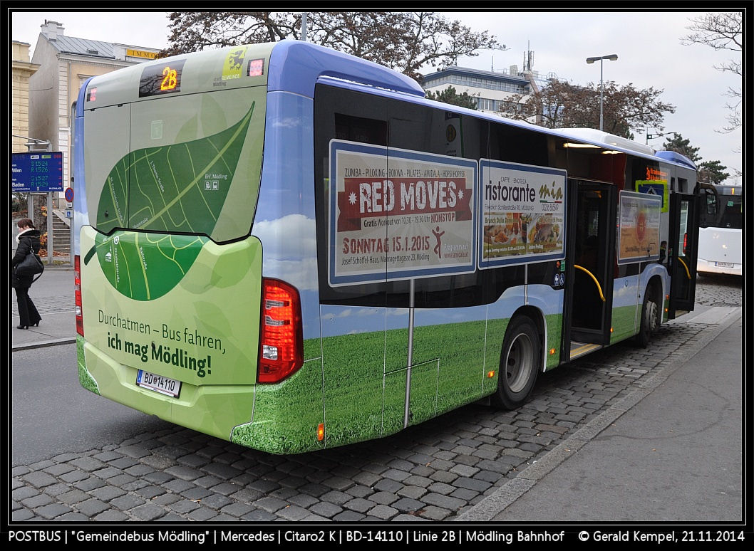 Das Fahrzeugheck wird für städtische Eigenwerbung des Mödlinger Busverkehrs genutzt.