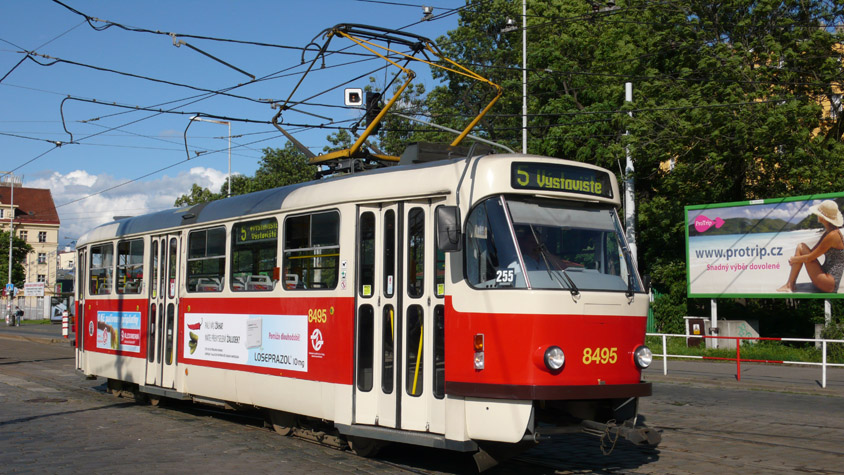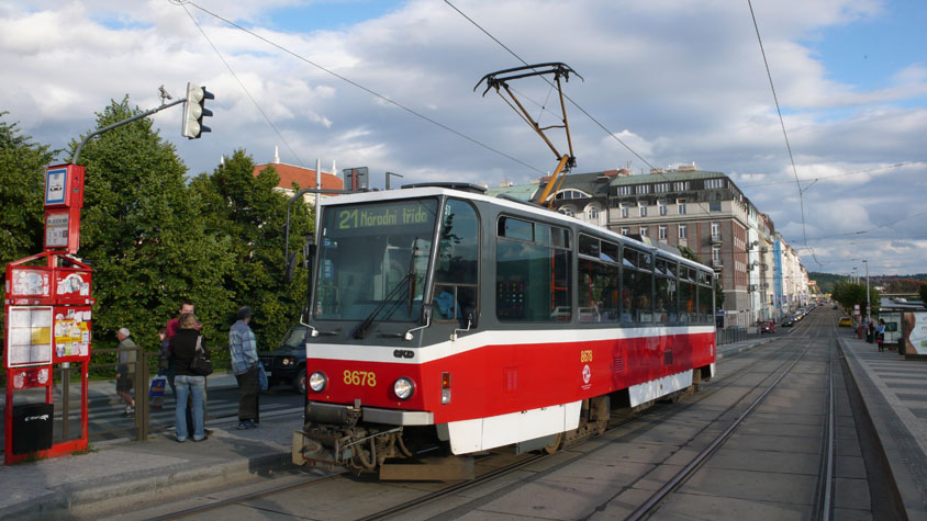 T6A5 8678 in der Haltestelle Palackeho namesti an der Moldau und T3 8495 kurz nach der Haltestelle Vystaviste beim Planetarium sind hier zu sehen.