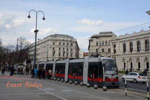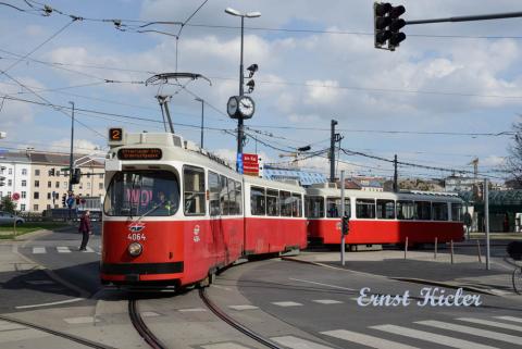 Bild 2 zeigt den Zug E2 4064 + c5 1435 beim Abbiegen in den Schottenring.