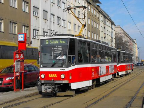 # T6 8658 in der klassischen Ausführung am 15.03.2013 am Güterbahnhof Žižkov