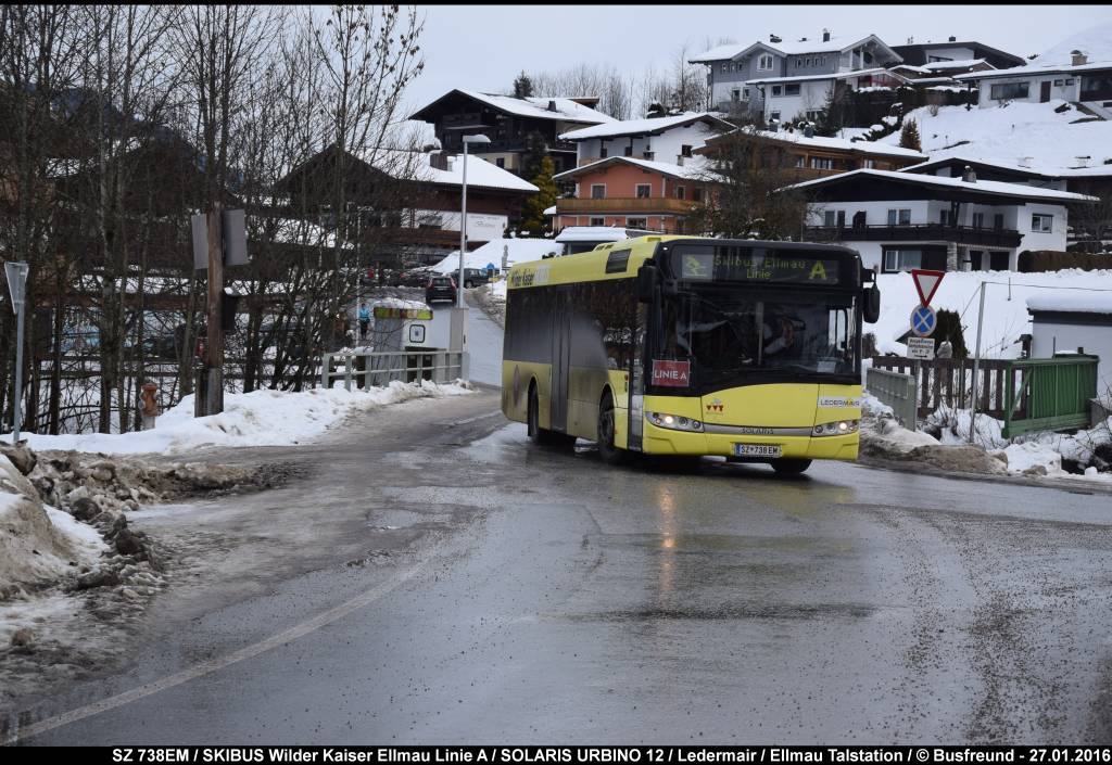 Auch in Ellmau ist der Skibusverkehr bereits voll im Gange. Recht unspektakulär wird dieser durch die Firma Ledermair ausschließlich mit SOLARIS URBINO 12 (2 und 3-türig) betrieben.