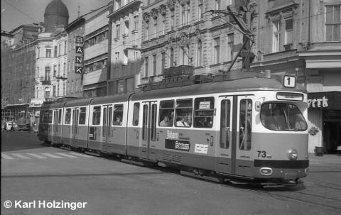 umgestallteten Wagen, Nummer 73, auf derLinie 1 unterwegs.
