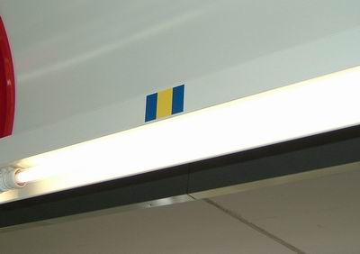 blau-gelb-blauen Aufkleber (Foto siehe Fotokiste) auf den Bahnsteigen und
