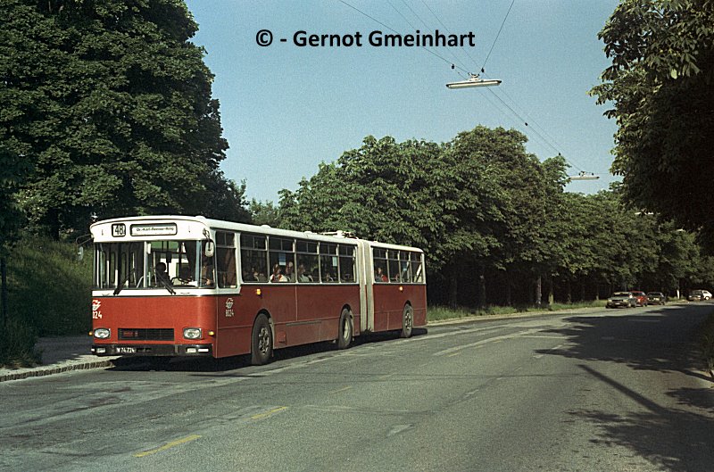 - Bus-Bild 4: 8024 auf Linie 48A in der Spiegelgrundstraße nächst Flötzersteig am 13. Juni 1988 (kurzes Intermezzo der Altbusse in der HVZ!)