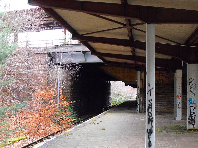 den unteren Bahnsteig, den vermauerten Tunnelzugang zur Bahnhofshalle und