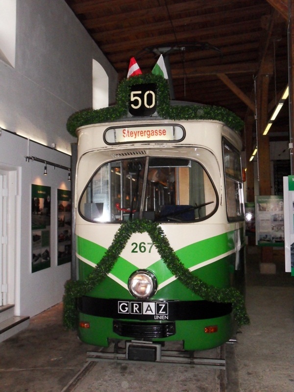 Im Tramwaymuseum wurde Wagen 267 festlich geschmückt. (NEIN, das war KEINE Besteckungsaktion von mir, das Steyrgasse wurde kurz vor der Abfahrt auch für andere Fotografen reingesteckt, und der Zug dann vor die Halle gestellt. Und das Ziel stimmte sogar, denn ich durfte bis zum Heimatbahnhof Steyrgasse ausserplanmäßig sogar mitfahren) -> Danke an den lieben Lenker, der mich fragte. Das war dann wohl meine offiziell