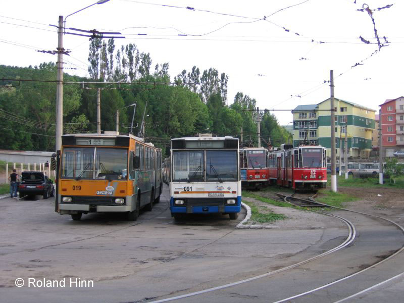 Straßenbahn. Die Parade bilden die beiden Rocar-O-Busse 019 und 091 sowie