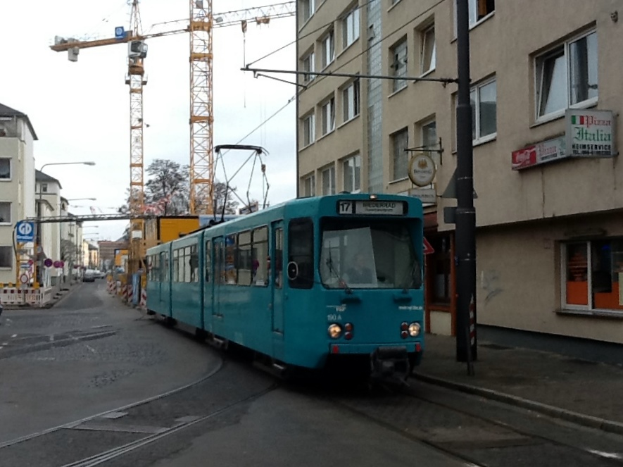Eingesetzt war der Pt heute auf der Linie 19, die lediglich aus zwei morgendlichen und mittäglichen Schülerkursen besteht. Dass die Brosebänder 17 anzeigen, ist entweder der Faulheit des Fahrers oder dem Umstand, dass die 19 nicht vorhanden ist, geschuldet. Es ist jedenfalls ein typisches Beispiel dafür, dass man auch bei der Frankfurter Straßenbahn gerne nach dem bei den Wiener Linien beliebten Motto "Weil's wurscht is..." handelt und zeigt, dass die Straßenbahn (die man noch Mitte der 90er nahezu komplett stillegen wollte) in Frankfurt noch immer ein ziemlich ungeliebtes Kind ist.
