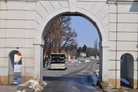 Welcher Torbogen wird in Kürze von diesem Postbus durchfahren?