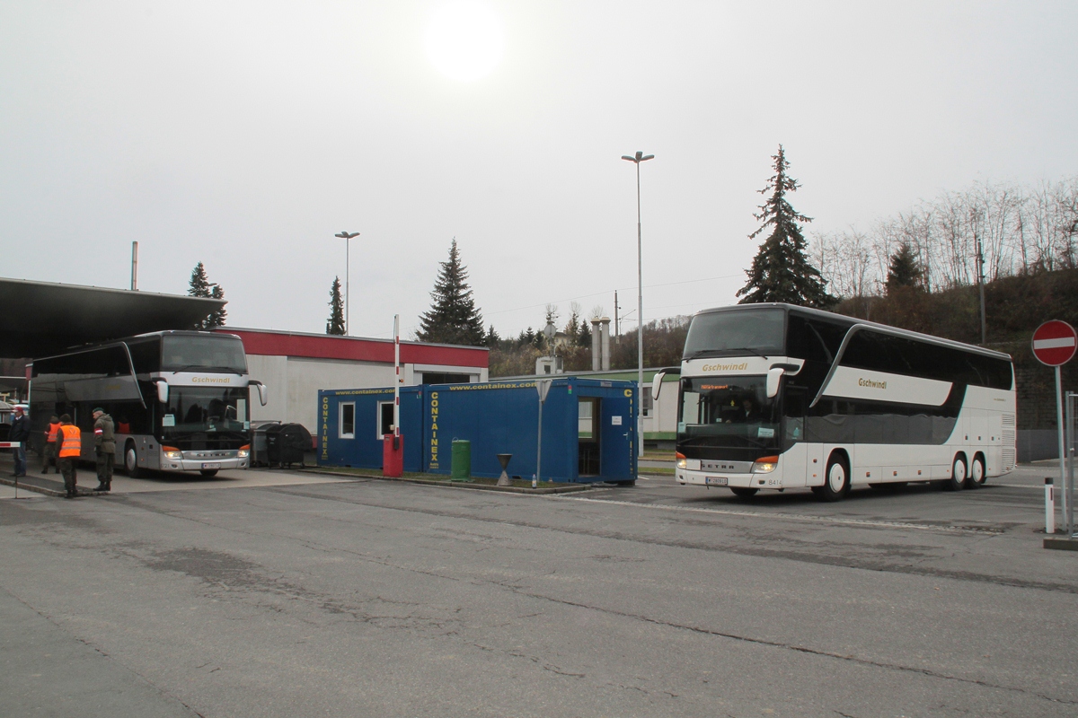 Es zeigt 2 Doppelstockbusse von Gschwindl am Grenzübergang Spielfeld,