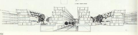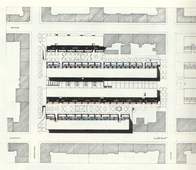 Grundriss sieht man gut rechts die Remisen, der Bau nimmt die Fluchtlinien