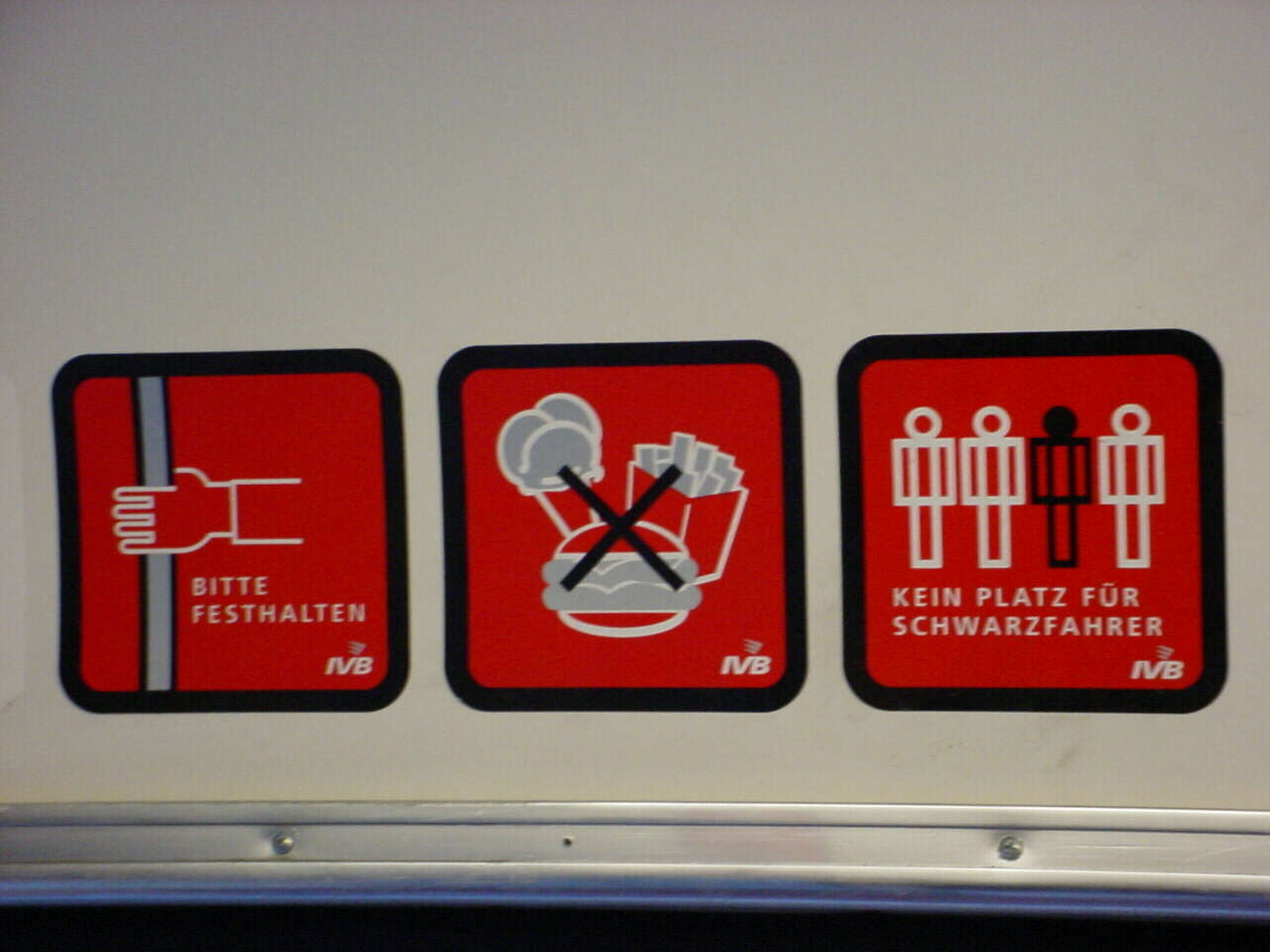 Verhaltensregeln-Aufkleber, wie sie ebenfalls in jedem Fahrzeug zu finden sind. Sämtliche Innenbeschriftungen, auch Wagennummer, Handyverbot in der ersten Reihe, Nothammer etc. sind derartige Aufkleber im IVB-Design.