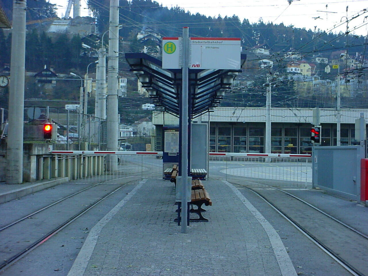Die Haltestellenanlage Stubaitalbahnhof der Linie STB mit Schranken. Die STB wechselt hier vom Stadtnetz auf die Überlandstrecke und durchfährt dabei auf einem kurzen Stück den Betriebshof.