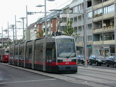 Zug der Linie 6 in Fahrtrichtung Zentralfriedhof knapp vor der