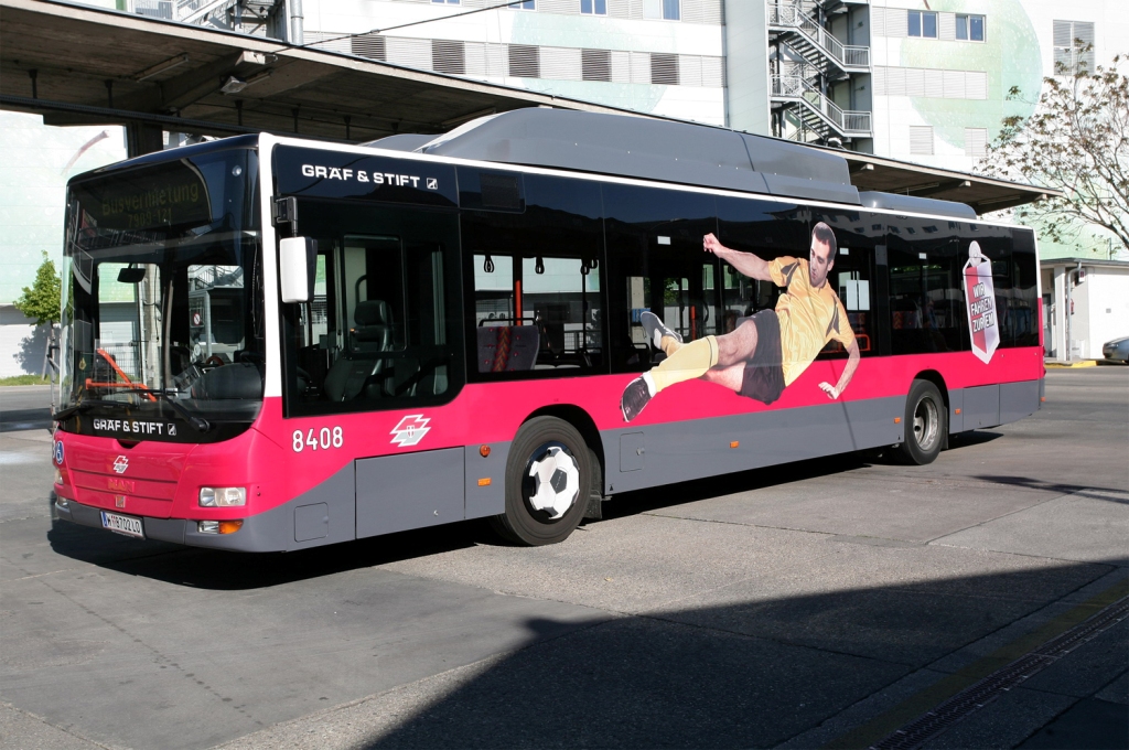 Der Bus 8408 hat ebenfalls am Heck der Fensterseite ein "Riesen-Kärtchen" mit dem Text "Wir fahren zur EM", dass ich leider nicht mehr aufnehmen konnte. Stolz könnens sein mit diesem Slogan, dass jetzt auch die U2 zum Stadion fährt... Ob man so die Fahrgäste motivieren will?