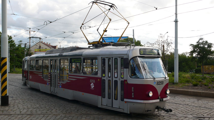 T3R.PLF 8259 zieht T3R.P 8564, sie biegen aus der Sokolovska in Richtung der Station Palmovka