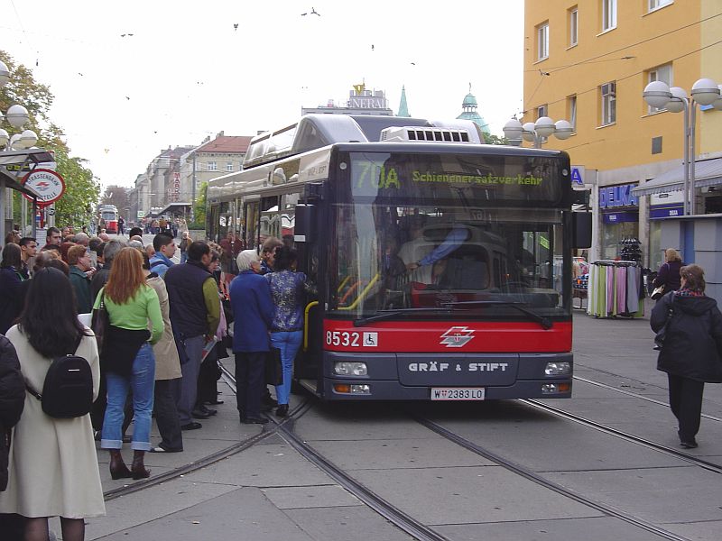 Am Bild Bus 8532 am Reumannplatz als Schienenersatzverkehr 70A (!),