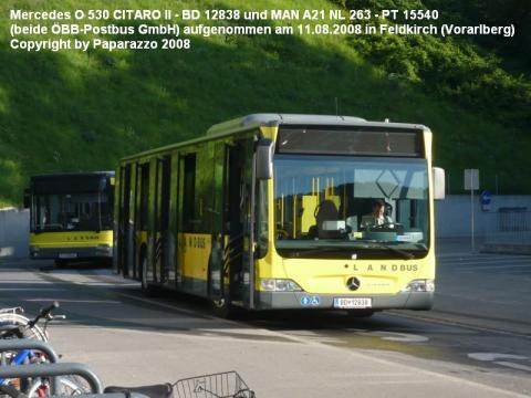 In der morgentlichen Sonne präsentiert sich hier das Fahrzeug BD 12838 in Feldkirch. Es handelt sich um einen Mercedes O 530 Citaro II im Landbusdesign. Mittlerweile wurde auch schon ein zweiter Bus dieses Typs von der ÖBB-Postbus GmbH in der Region Vorarlberg in Dienst gestellt. Im Hintergrund zu sehen ist ein MAN A21 NL 263 (PT 15540) der bereits auf seine nächste Abfahrt wartet.
