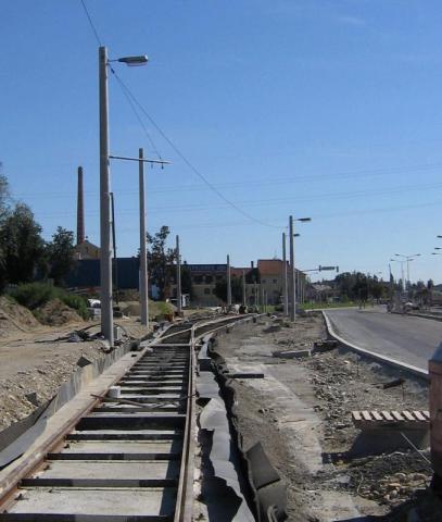 Bim (Haltestelle Brauhaus, hinten unten wo die Masten rauswachsen) in