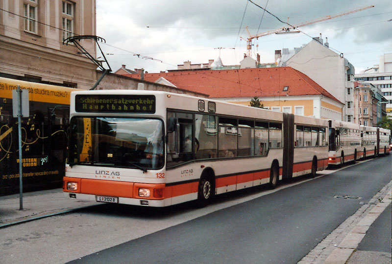 aus Richtung Norden. Der MAN A11 (NG 272) mit der Wagennummer 132 im ersten