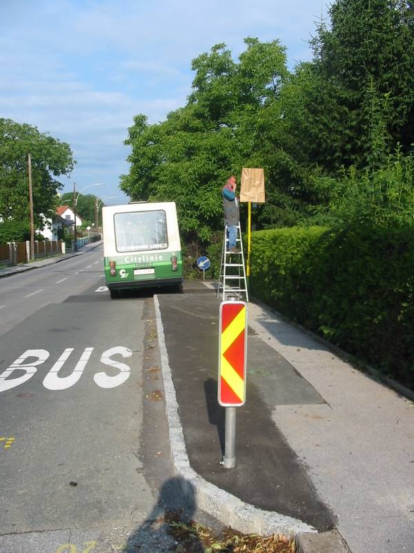 Montieren des Haltestellenschildes an zweiterer, gestern fotografierte ich