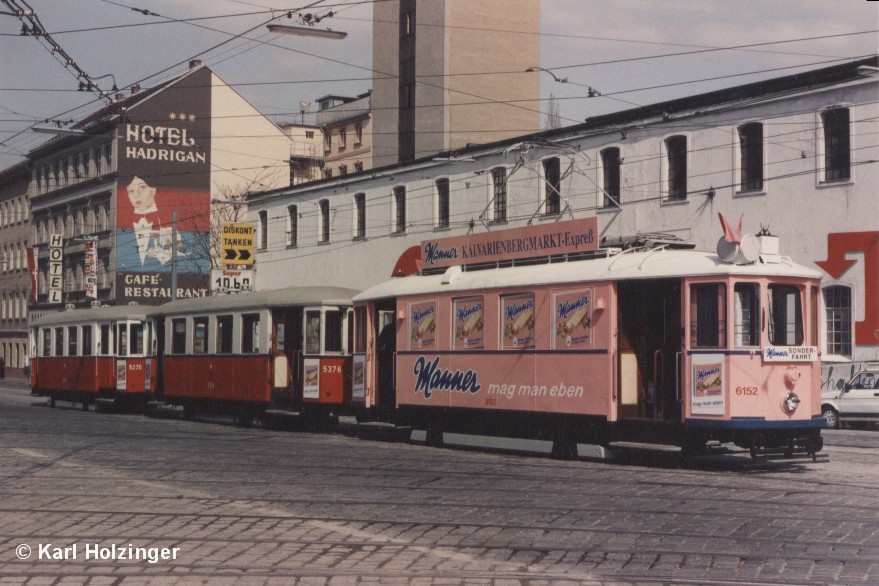 Zur Abwechslung mal was Farbiges. 6152 in einem der eher selteneren Einsätze im Dreiwagenzug. Datum leider unbekannt, aufgenommen in der Maroltingergasse.