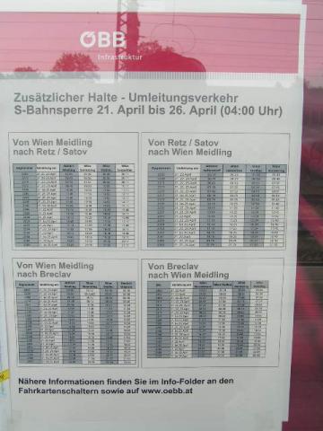 In Leopoldau angekommen den (nicht gerade prominent plazierten) Baustellen-Zusatzfahrplan gefunden, der den 14h25 aber nur für DO 21. und FR 22.4. ankündigt, aber nicht heute SO 24.4. - auch der Bildschirm am Bahnsteig kündigt den Zug nicht an. Bilder beigefügt, Fahrplan leider kaum lesbar, habe zu sehr an der Auflösung gespart :-(