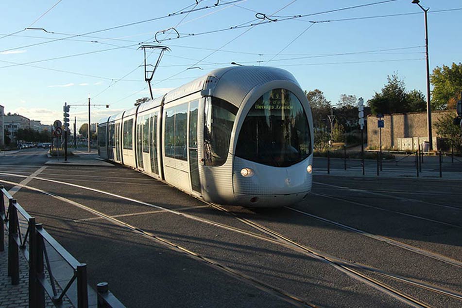 Das eine Bild zeigt eine Citadis 302 Straßenbahn, der Standardtyp in Lyon