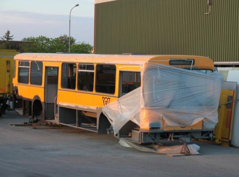 Der Bus steht "verpackt" und mit "neuem" Fahrgestell, derzeit auf einem öffentlich