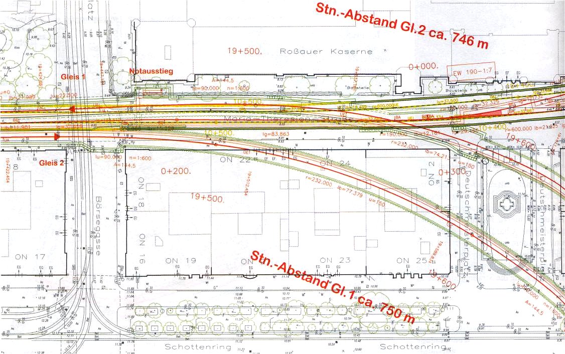 Das Gleisschema Schottenring - Schottentor sowie ein Ausschnitt aus dem