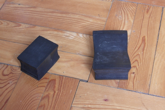 > Mittels eines Konus, der eingeölt wird, werden die Gummiblöcke