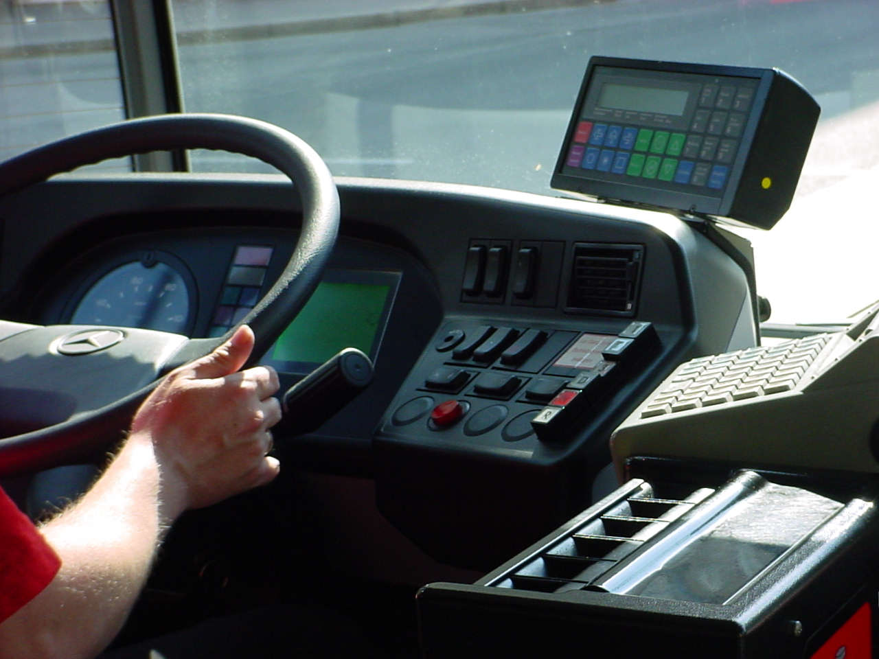Der Fahrerplatz des Citaro NG. Rechts unter dem IBIS der VVT-Ticketprinter,
