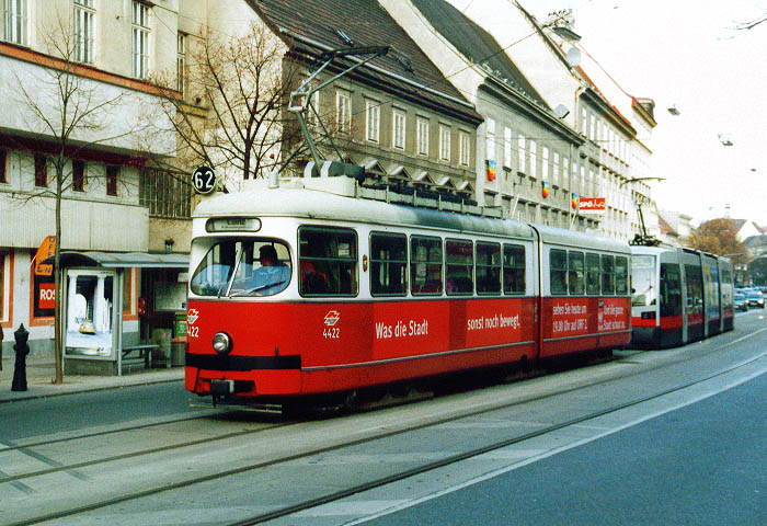 Johann-Strauß-Gasse - Wagen 4422 des Typs E als 62er gefolgt von einem ULF
